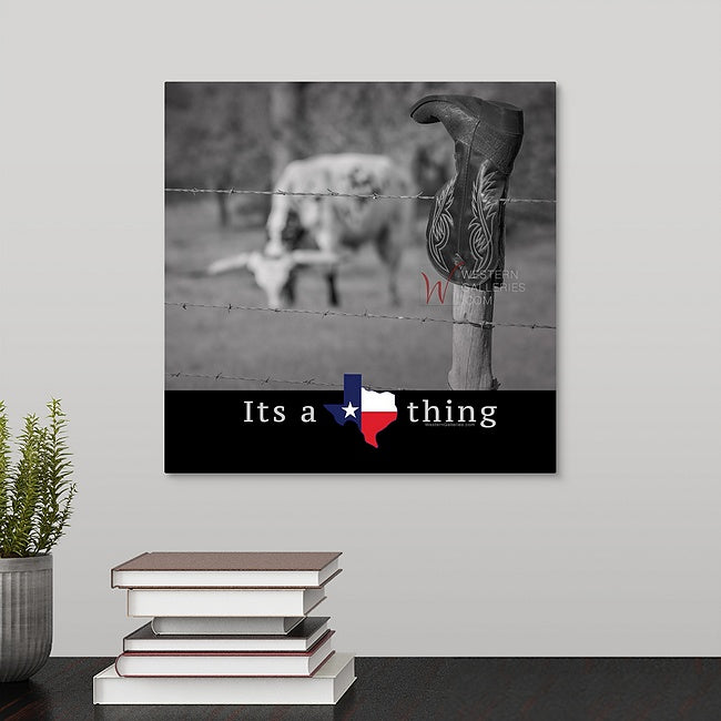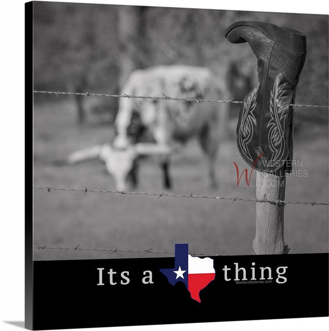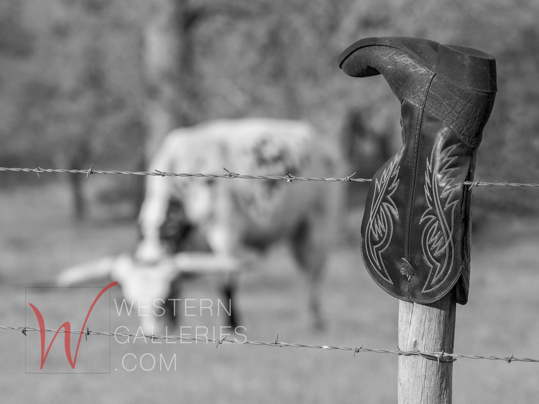 A photographic image of a couple Texas icons ... an old cowboy boot hanging upside down on a fence post with a Longhorn steer in the background.