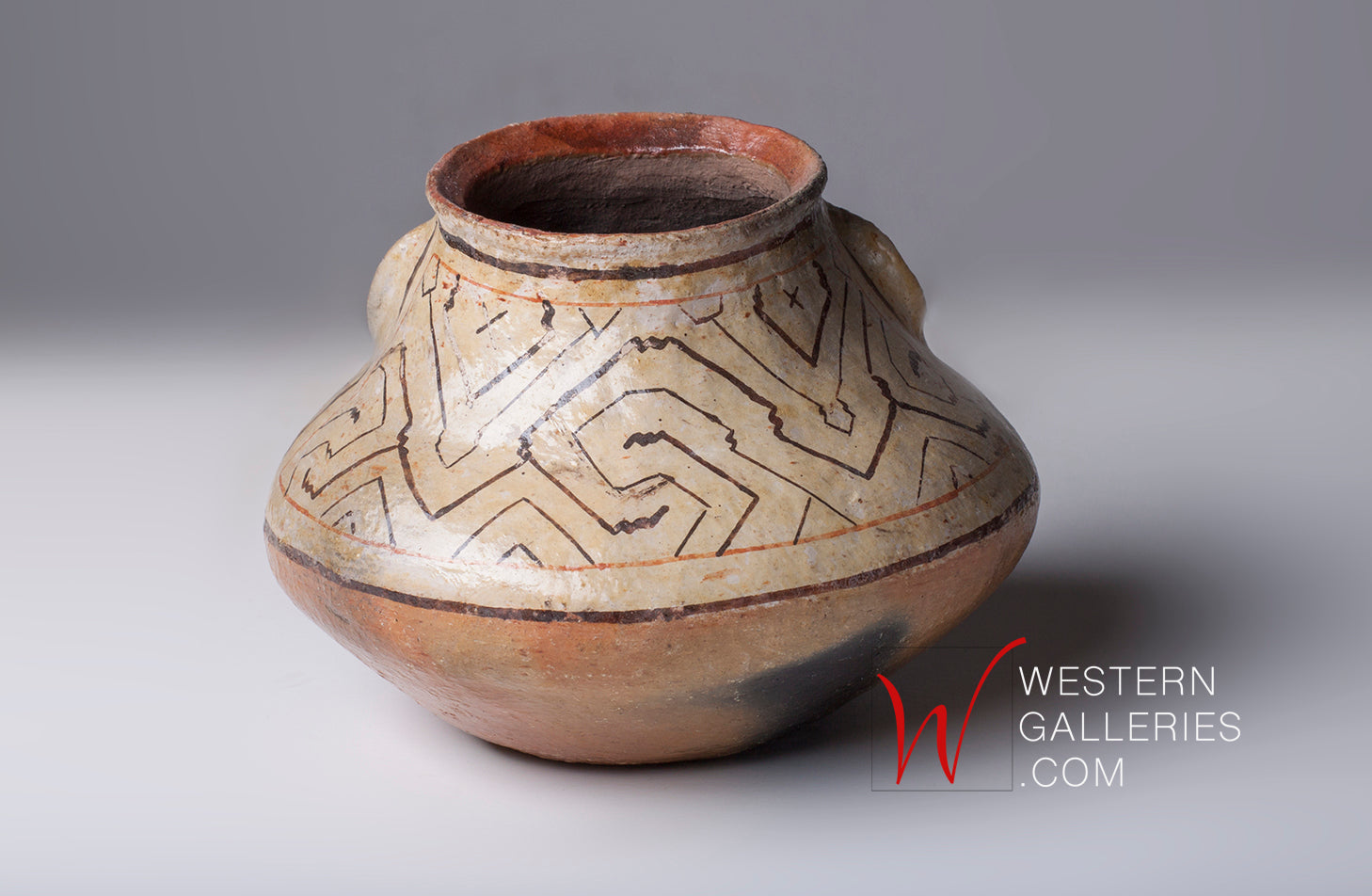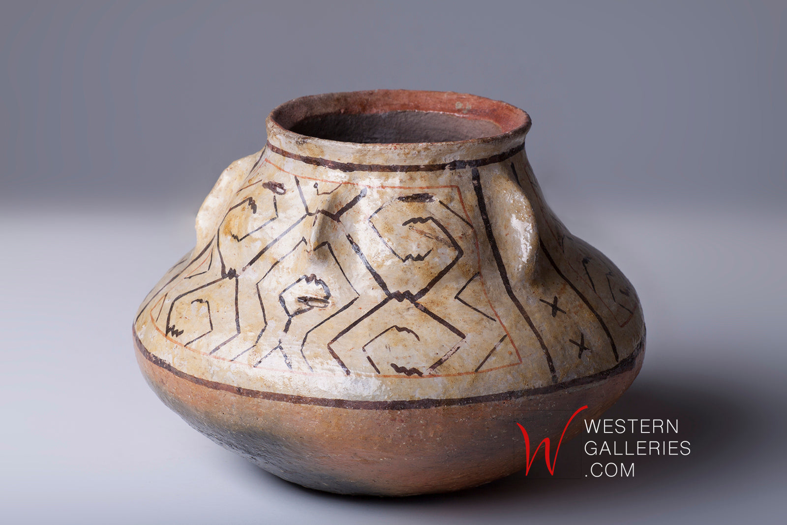 This is an excellent speciman with a face sculpted into the side of the pottery bowl. Hand painted inside the rim and on all exterior sides with dark brown (black), tan, and red Native earthen paints.