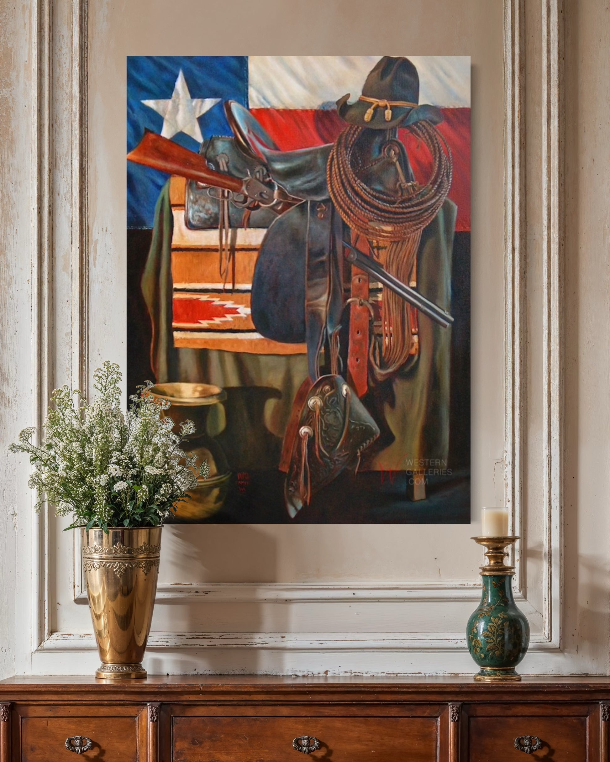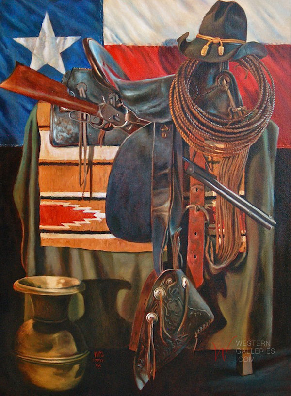 NOTE: This original 1870's period with Texas flag, Winchester rifle, saddle gear, still life oil painting is located at the artist's studio in Somerville, Texas.