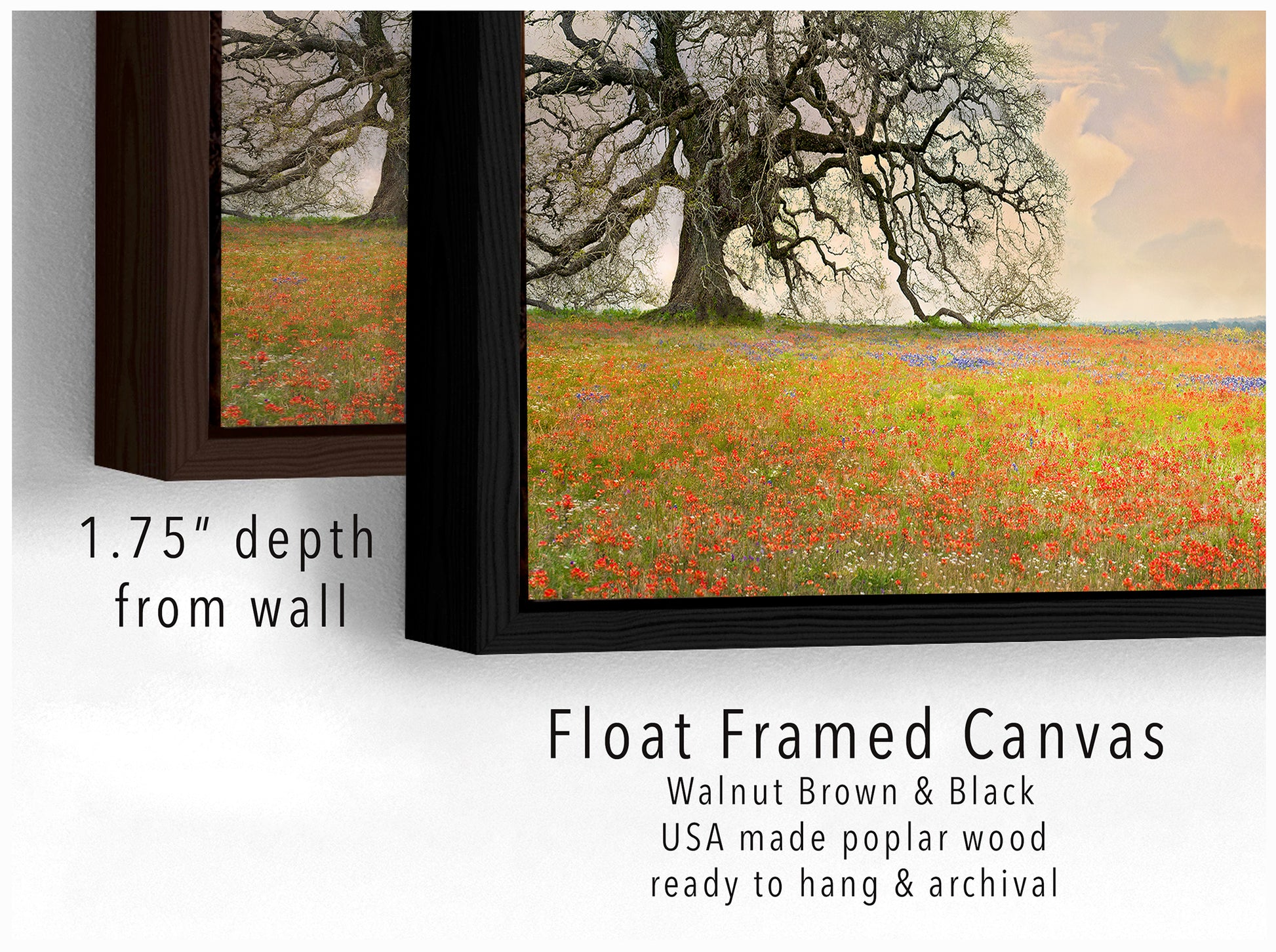 - Float Framed Canvas - Same canvas with USA made poplar wood thin float frame, sealed back, 1.75" depth from wall, & ready to hang.