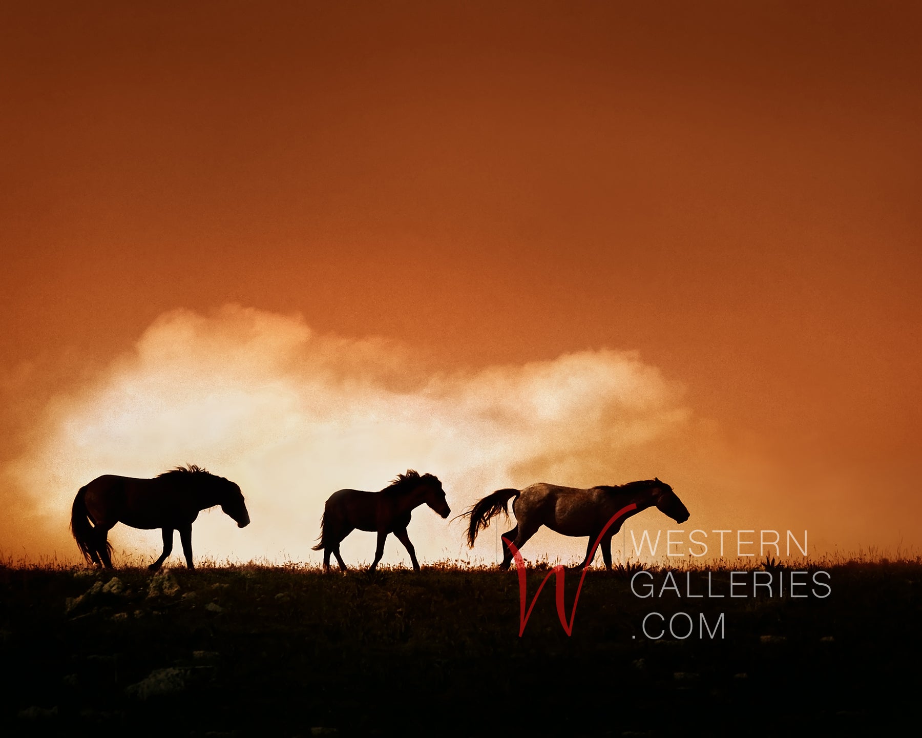 The stallion, Santa Fe, is moving his family over the ridge at sunset. Shortly after this photo was taken, the yearling (in the middle) were rounded up by the BLM and removed from their mountain home.